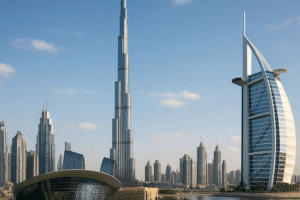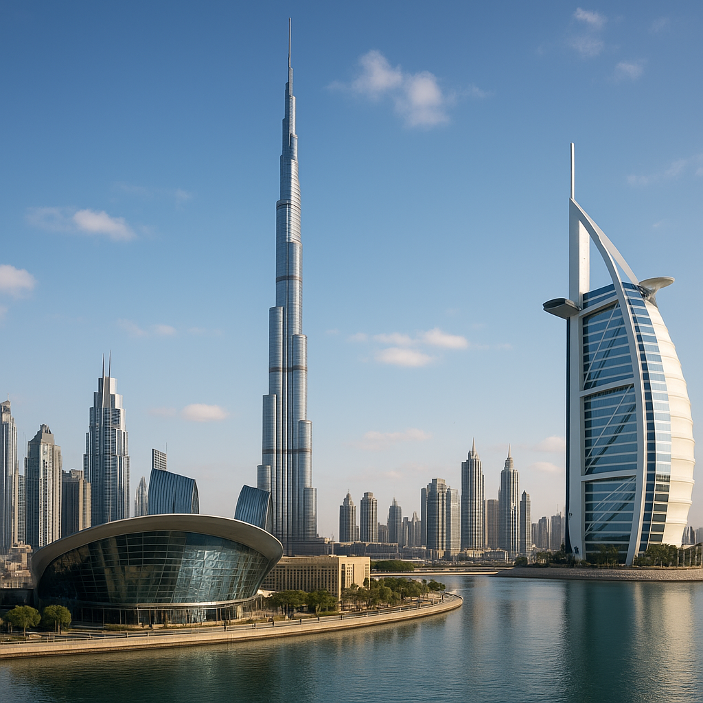- Wolkenkratzer mit auffälligen Formen, die oft an Segel, gläserne Kristalle oder orientalische Elemente erinnern.